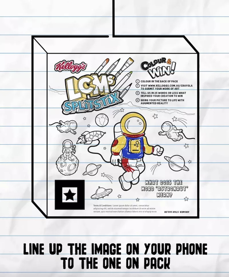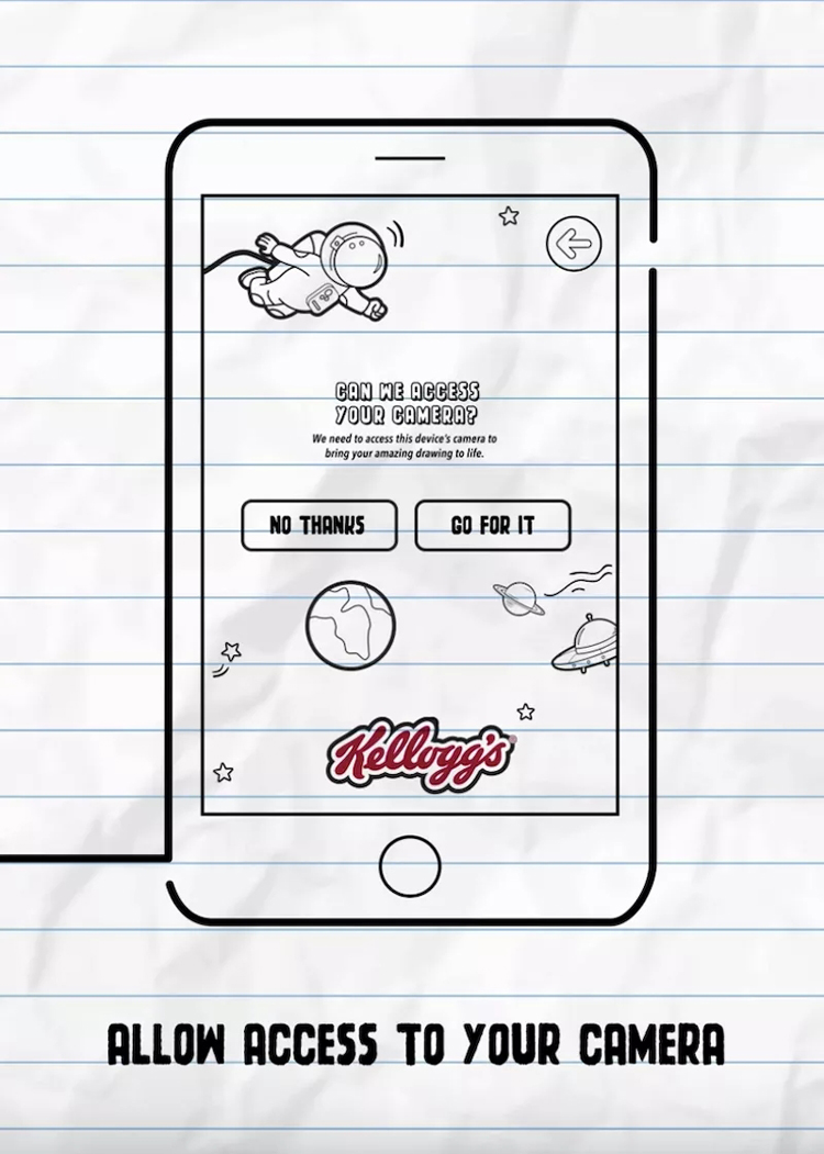 要玩噱头当然不只填色那么简单,填完色的人物/动物居然还能够动起来!与创意机构The Kinetic Agency以及艺术用品商Crayola携手,家乐氏就推出了一个APP,孩子们只要通过手机相机对准画好的形象,通过AR技术,就可以变成动画啦。