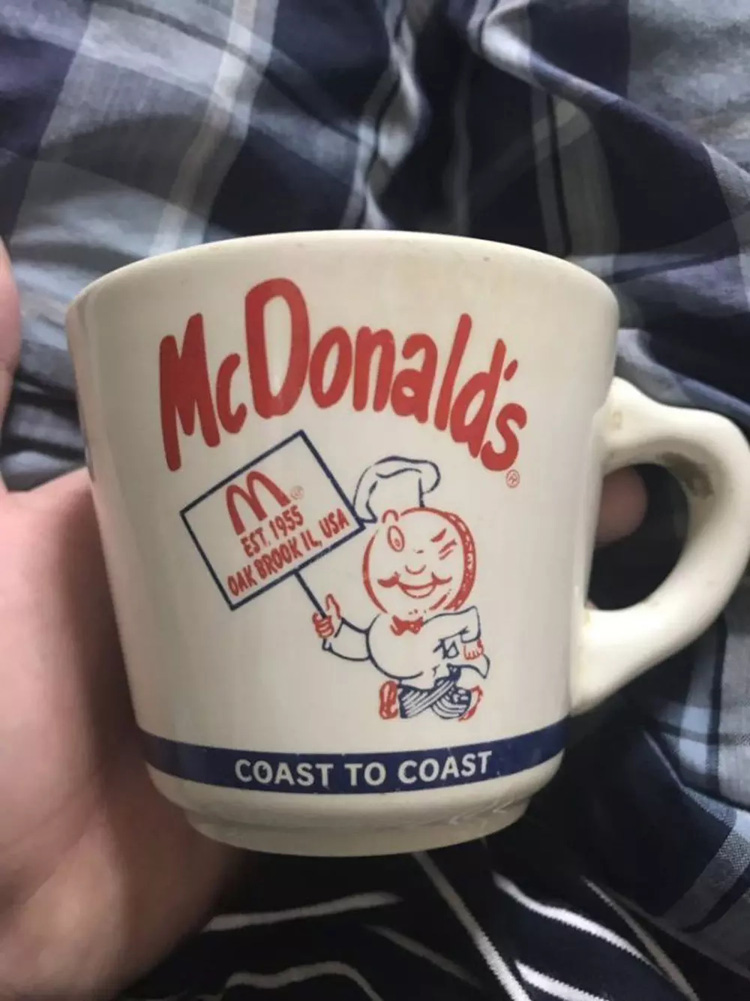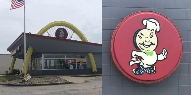 照片中可以看见,金黄色M 字被分成两半,而招牌上那位厨师形象的人物,更是无比陌生,完全联想不到如今的麦当劳。