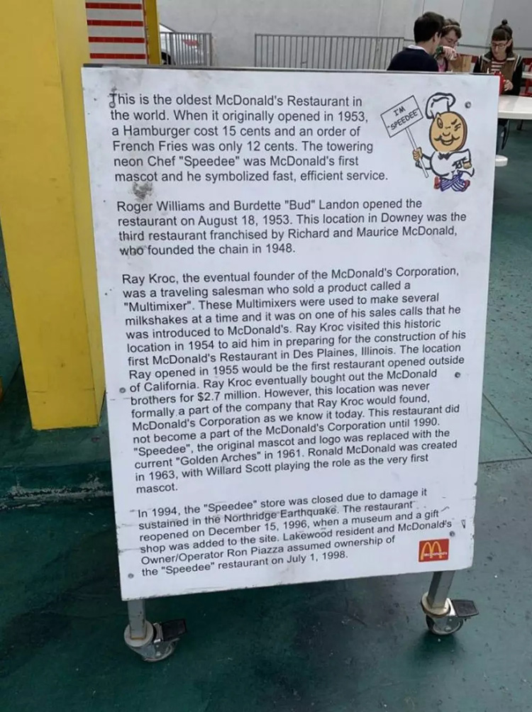 原来他是麦当劳最早期的吉祥物“Speedee”,堪称麦当劳叔叔、汉堡神偷等人的大前辈。还有网友实际走访洛杉矶现存历史最悠久麦当劳分店,将店家放在门前的说明看板拍了下来。麦当劳最早是在1953 年于此开始营业。