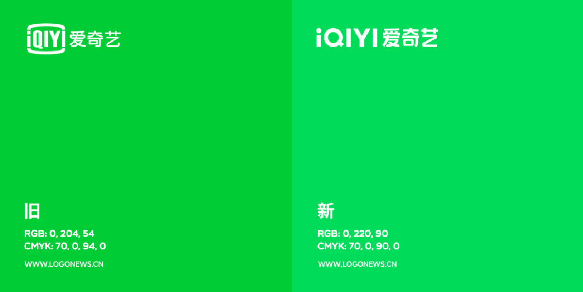 从上面的新旧对比中可以直观地发现,爱奇艺全新启用的LOGO中外边框不见了!而且品牌色也发生了明显的变化。