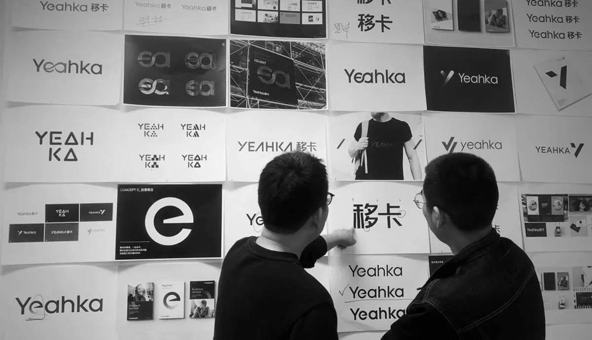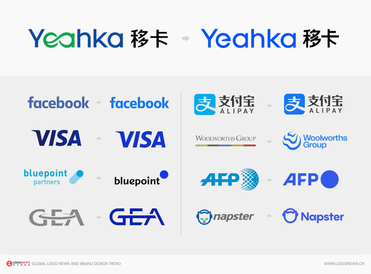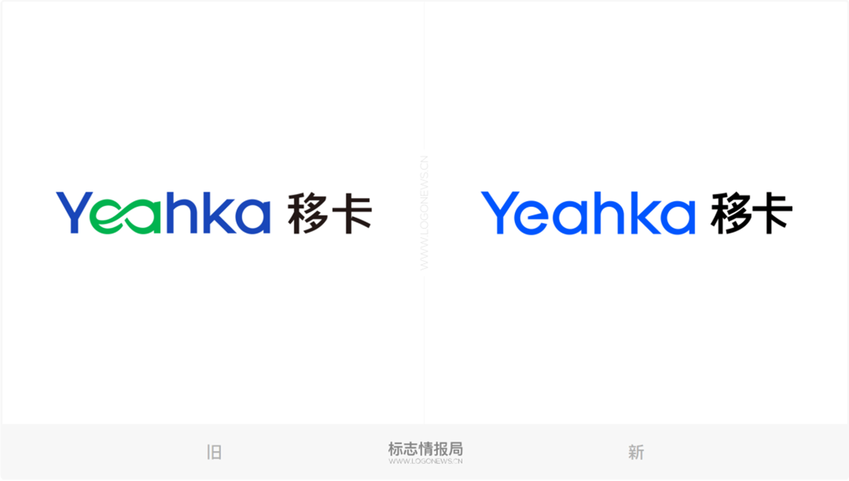 首先,重新设计的「Yeahka」字体把原先连接在一起的「ea」两个字母完全独立分开,并将颜色统一为蓝色。基于大量的圆形框架调整笔画,弱化了锋利感,使字体结构更加清晰,视觉层次更加分明。