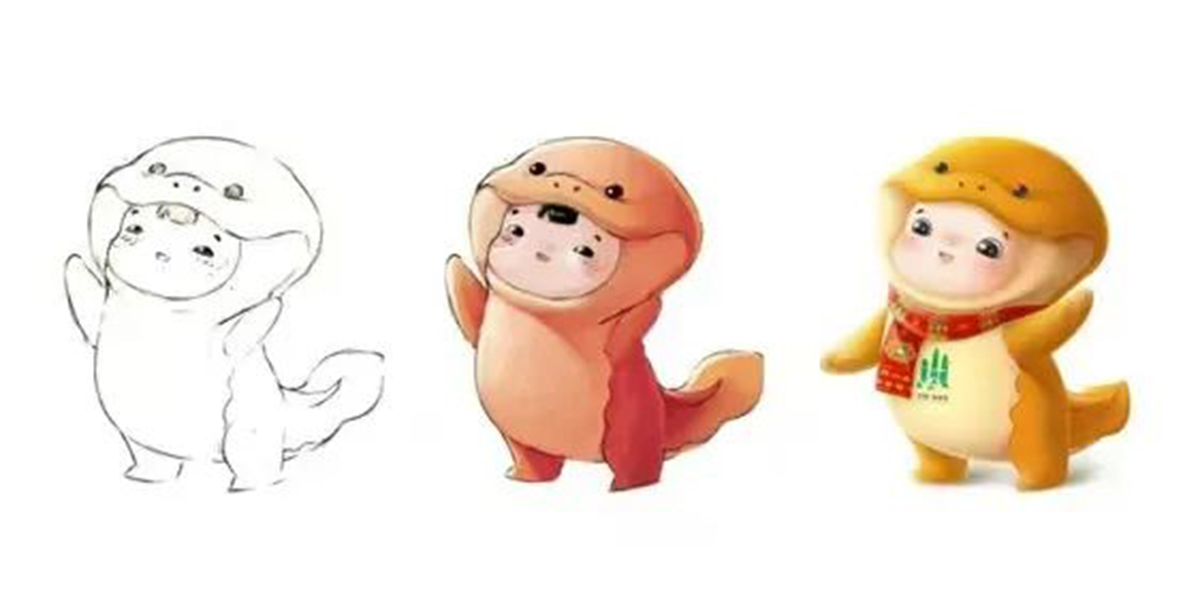 鲵宝宝则是以国家二级水生野生保护动物-大鲵为灵感设计,以明亮的黄色为主设计。整个身体呈圆滚滚的造型,脸部是一个萌萌的小孩形象,像是套上大鲵造型的头套,而围巾上一样加入了西兰卡普纹饰图案。