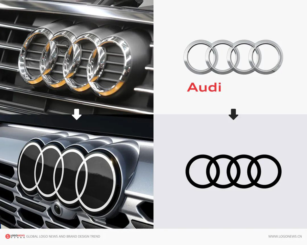 最近,德国知名汽车品牌奥迪也加入了这一阵列,为其车辆重新设计了一个具有纯粹主义理念的扁平化车标。