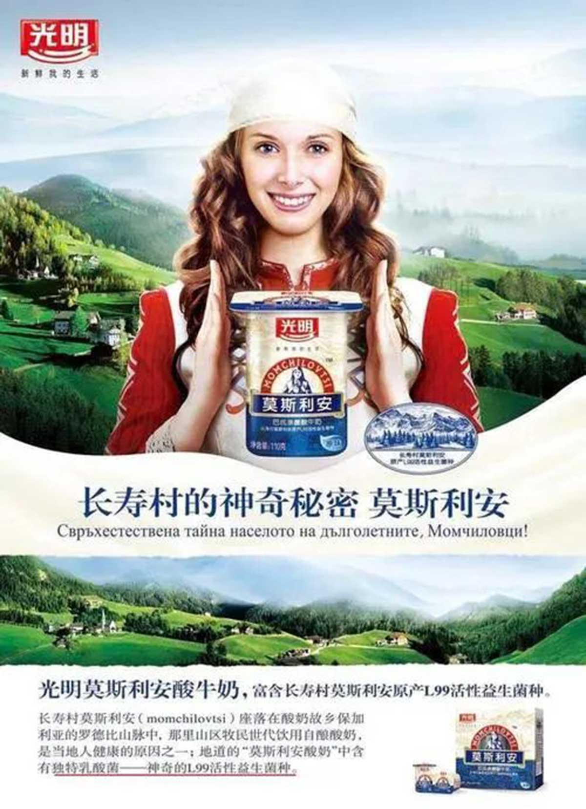 光明旗下高端酸奶品牌莫斯利安,名字源于世界5大长寿村之一的保加利亚莫斯利安村。诺贝尔生理暨医学奖获得者梅契尼可夫在旅行时途经该村落,发现村中百岁老人众多。经研究发现,村民每天都有饮用自酿酸奶的习惯,而他们的酸奶中含特有的活性益生菌L99。