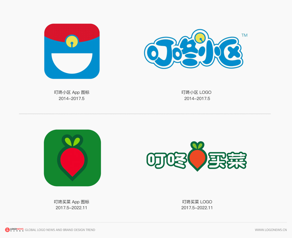 叮咚买菜的前身为成立于2014年3月的社区服务平台「叮咚小区」,2017年5月,「叮咚小区」正式更名为「叮咚买菜」,以「29分钟内即可即使配送到家」的模式提供生鲜到家服务。当年「叮咚小区」的LOGO也很有意思,不说你应该也能看出来设计灵感来自哪里。「叮咚买菜」上线后,推出了全新的「红萝卜」品牌LOGO并一直用到了今天。