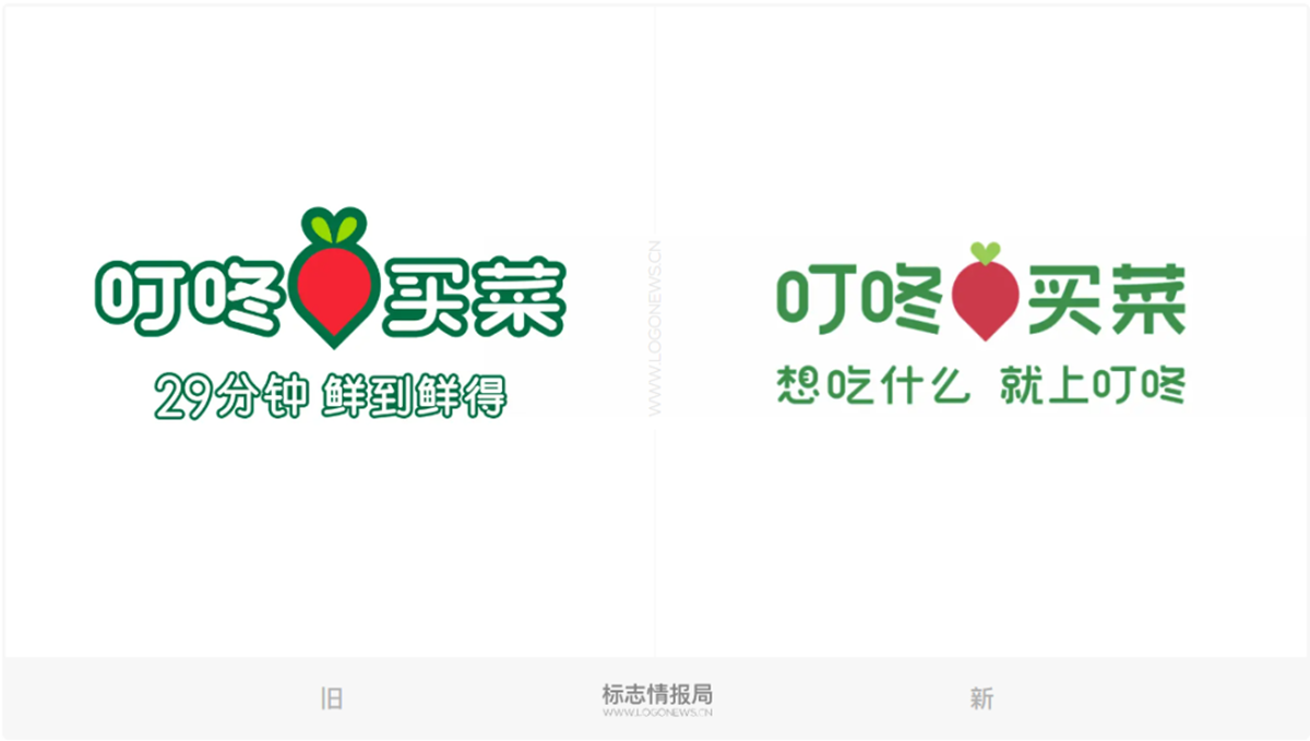 去掉轮廓描边后,红萝卜显得更加圆润肥硕,两片绿色的萝卜缨连接在一起,形成一个绿色的心形「♥」符号。品牌口号也从之前的「29分钟鲜到鲜得」变更为「想吃什么 就上叮咚」。个人理解的是,前者强调高效率的便利购物体验,后者则囊括了生鲜美食等满足各类家庭生活所需的产品。