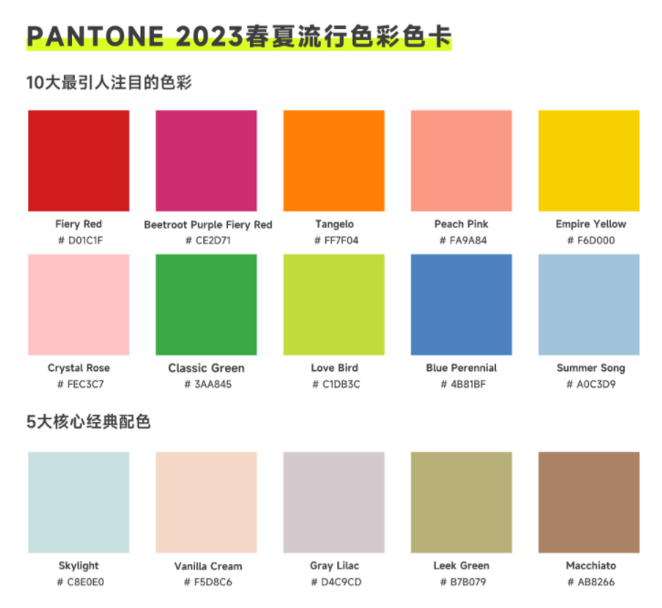 9 月初,国际知名色彩权威机构 Pantone 为时尚界发布了 2023 年春夏色彩趋势报告,确定了十大最引人注目的颜色,以及适合时装设计师推出新作时使用的 5 种经典色彩。