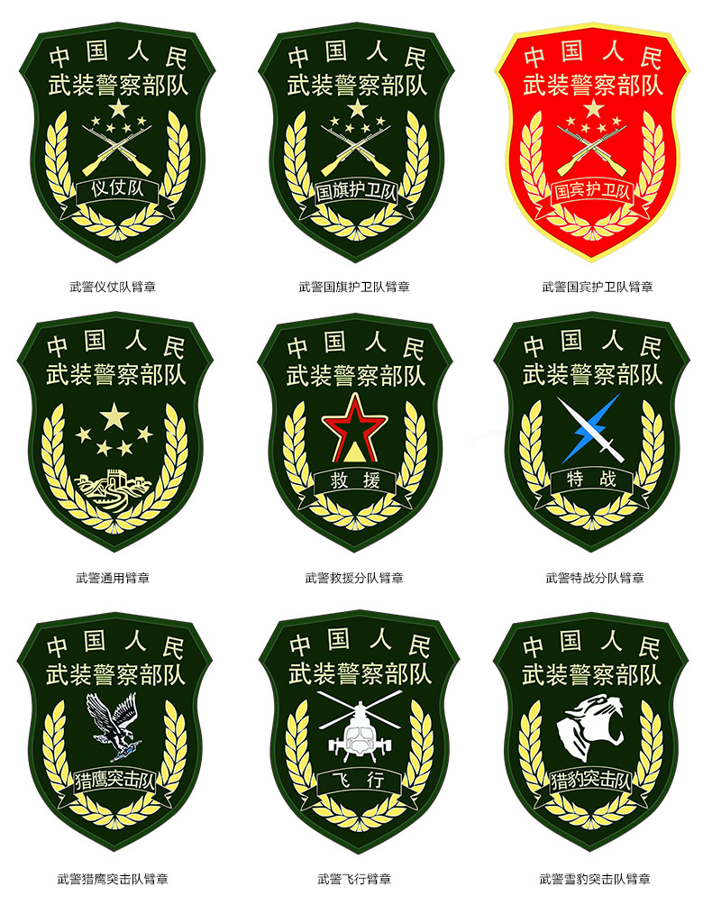 新式臂章分为通用臂章和特殊勤务臂章,通用臂章全部队统一款式,用于常服、执勤服、作训服、作训大衣、棉大衣、文工团演出服。特殊勤务臂章共八类,分别为仪仗队、国旗护卫队、国宾护卫队、救援、特战、猎鹰突击队、雪豹突击队和飞行分队臂章,佩戴于各自专业服装。