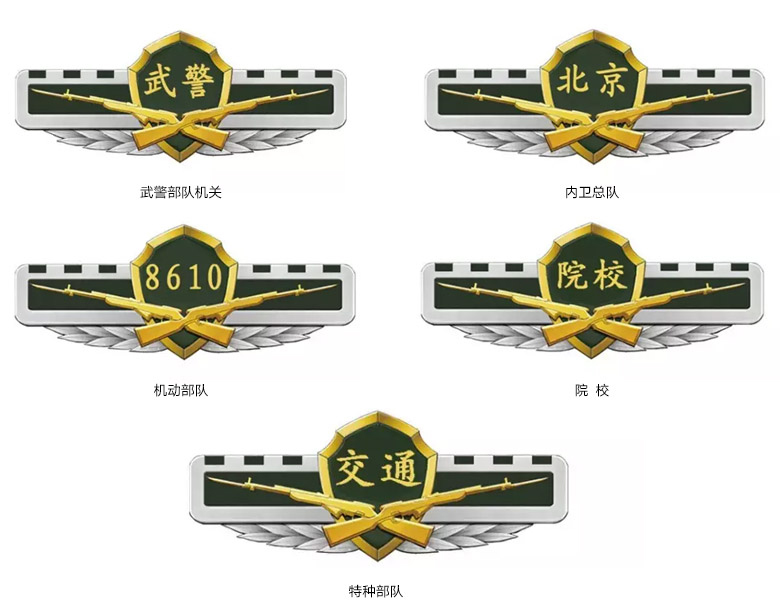 新式胸标分金属和织唛两款九类,用“武警”、“北京”、“机动部队代号”、“院校”、“警种部队名称”等字样区分单位,胸标中心图案由盾牌和双枪构成,双枪以56式半自动步枪为原型,象征军事属性,左右两侧为长城象形设计,象征武警部队是国家武装力量的组成部分,盾牌是武警部队的特色符号,盾牌下配橄榄枝,寓意和平稳定。